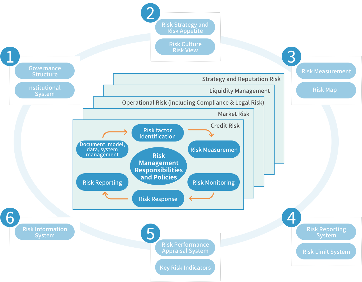 Taking “system, system and product” as the mainstay, the Company continues to improve its comprehensive risk management system, and has established a “5+1” risk governance system covering risk governance structure, strategy and preference, risk measurement, risk reporting, performance assessment and information system, which has contributed to the sound development of its business.